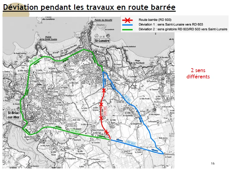 Pour la réalisation de ces travaux, des contraintes à la circulation seront à prévoir et des déviations seront mises en place. Du 24 juin au 5 juillet, la voie communale vers Saint-Briac sera fermée et une circulation alternée par feux entre 9h et 16h sera mise en place ponctuellement sur la route départementale 503.